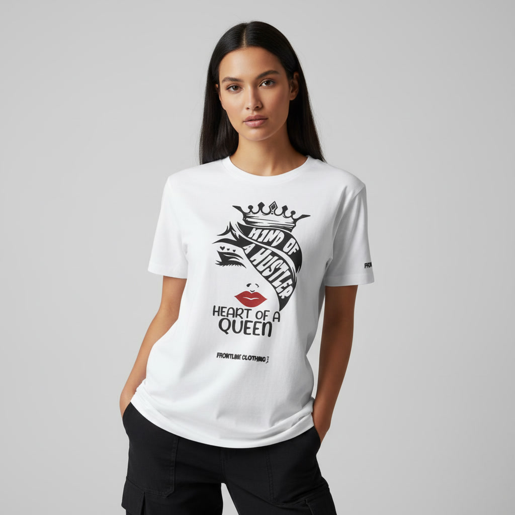 Strength and ambition define this standout piece from Frontline Clothing. The “Mind of a Hustler, Heart of a Queen” white tee represents resilience, drive, and feminine power.